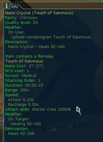 .ncu run 125738After entering combat, I set my health to 500 and asked medinos to heal me. It quickly ran low on nano from chain healing.